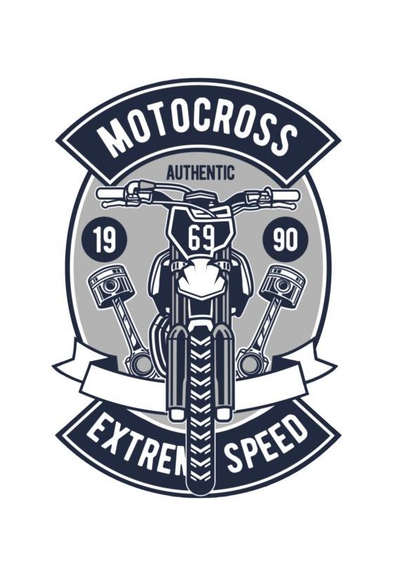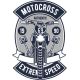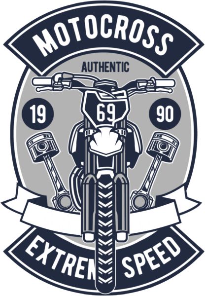Σχέδιο σε στυλ emblem με motocross bike και έμβολα κινητήρα, διακοσμημένο με πανό Motocross Authentic και Extreme Speed.