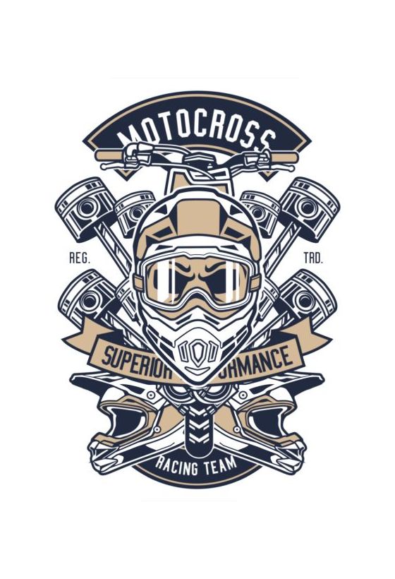 Γραφιστικό σχέδιο με κράνος motocross και γυαλιά, με φόντο έμβολα και τιμόνια, σε έμβλημα με bold τυπογραφία.