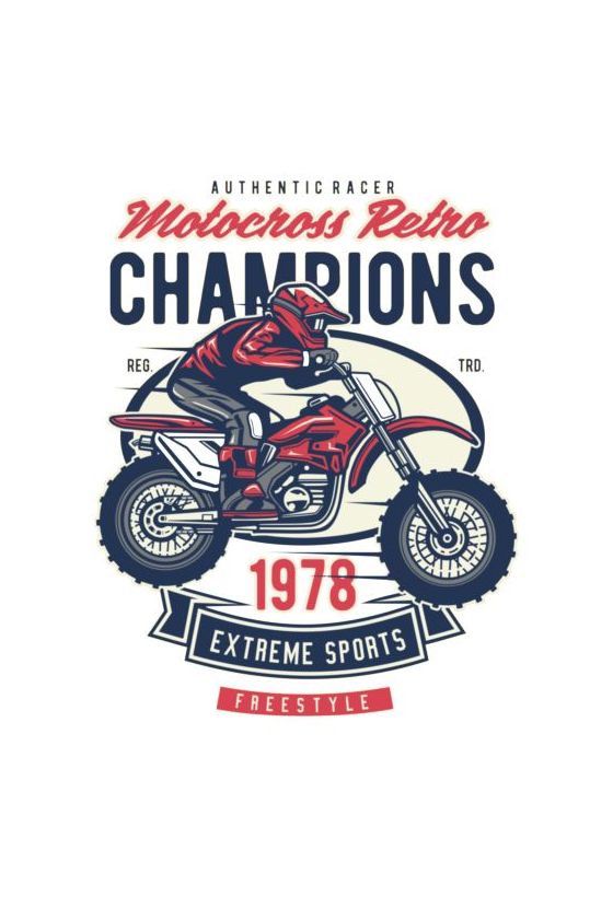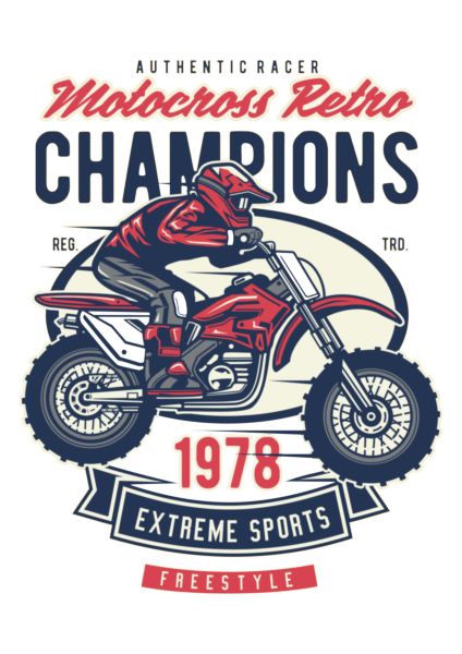 Ρετρό σχέδιο με motocross rider σε κόκκινη μηχανή, με στοιχεία τυπογραφίας όπως Authentic Racer και Extreme Sports.