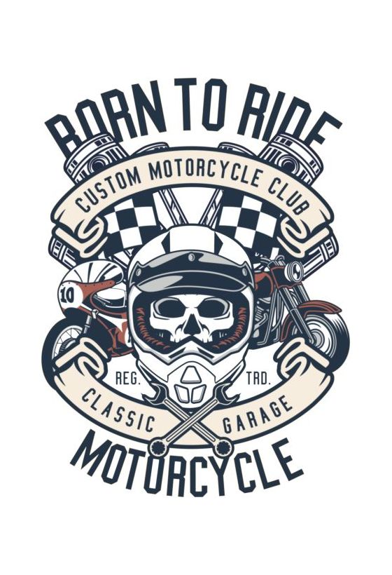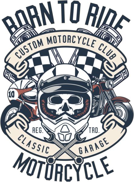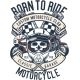 Έμβλημα με κρανίο και κράνος, σταυρωτά εργαλεία, επιγραφή «BORN TO RIDE».