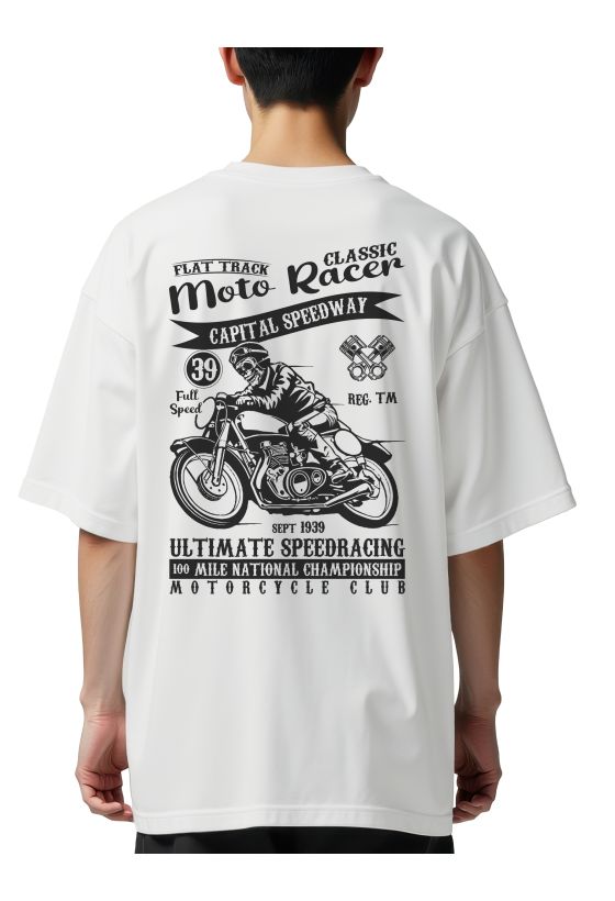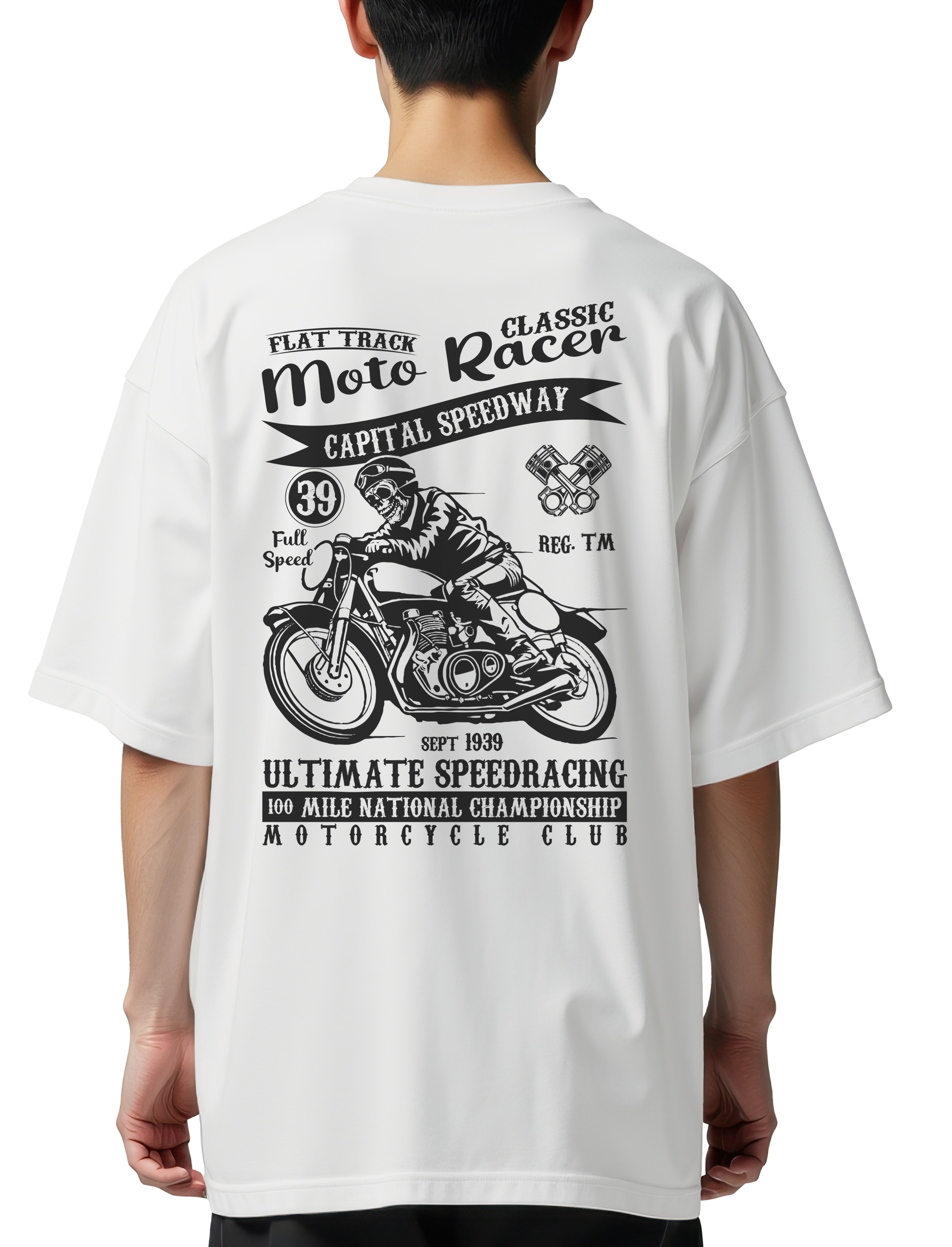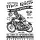 Vintage σχέδιο με flat track moto racer, κράνος και γυαλιά, σε σκοτεινό φόντο με στοιχεία αγωνιστικής αφίσας.