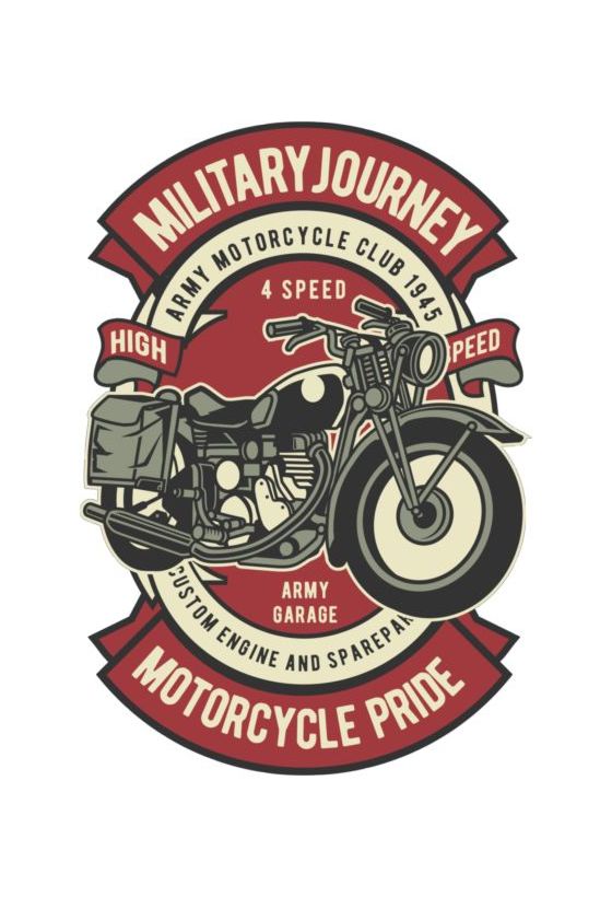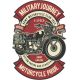 Έμβλημα vintage για το Military Journey Army Motorcycle Club 1945, με κλασική μοτοσυκλέτα και αγωνιστικά στοιχεία.