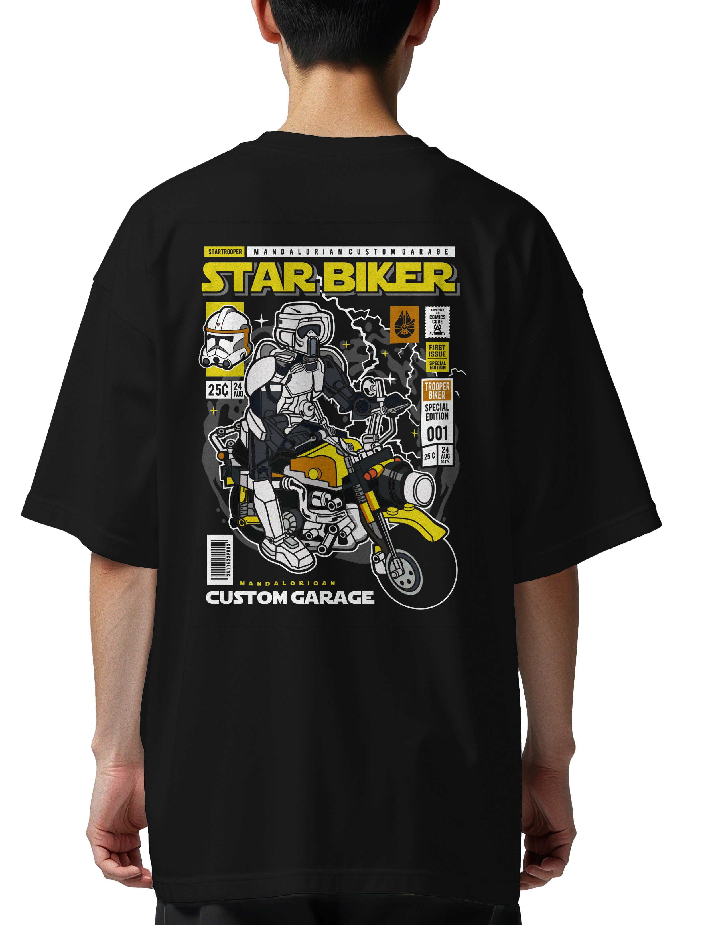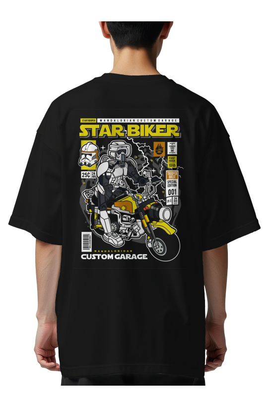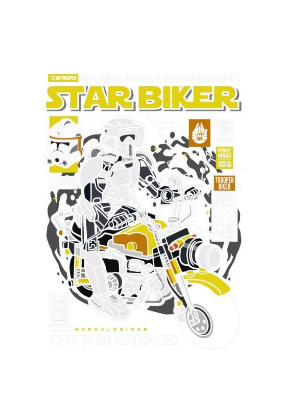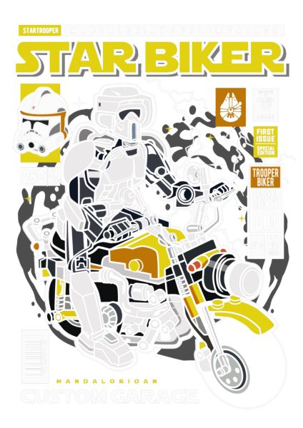 Star Wars soldier σε μοτοσικλέτα, τίτλοι "Star Biker" και "Mandalorian Custom Garage".