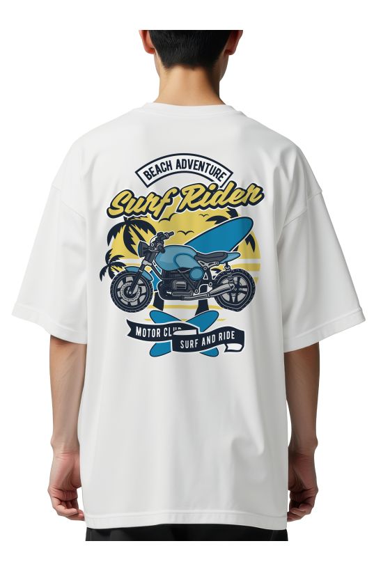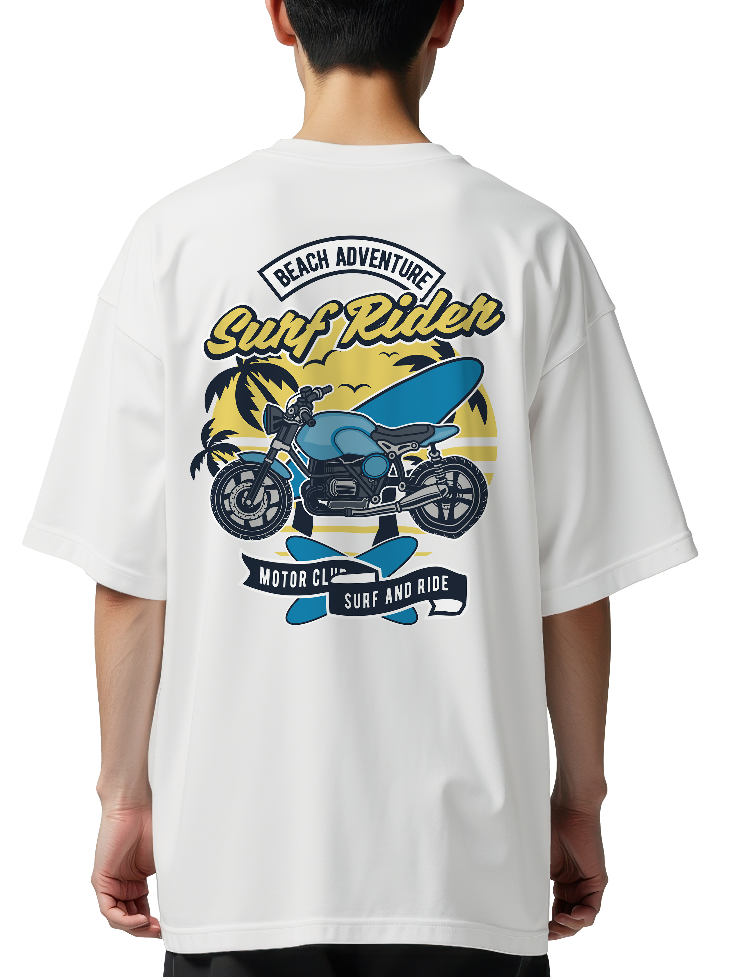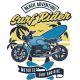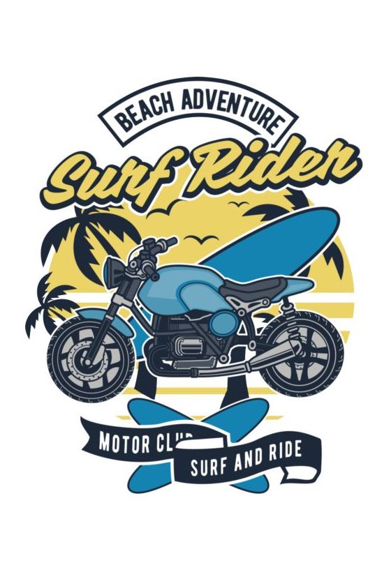 Μπλε μοτοσικλέτα με σανίδα surf, φόντο με ήλιο και φοίνικες, πανό "BEACH ADVENTURE", "Surf Rider".