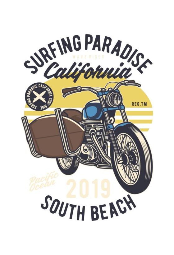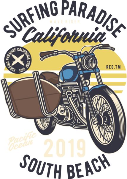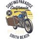 Vintage μοτοσικλέτα με surf board μπροστά από ήλιο, κείμενα "Surfing Paradise", "Pacific Ocean", "South Beach 2019".