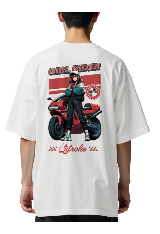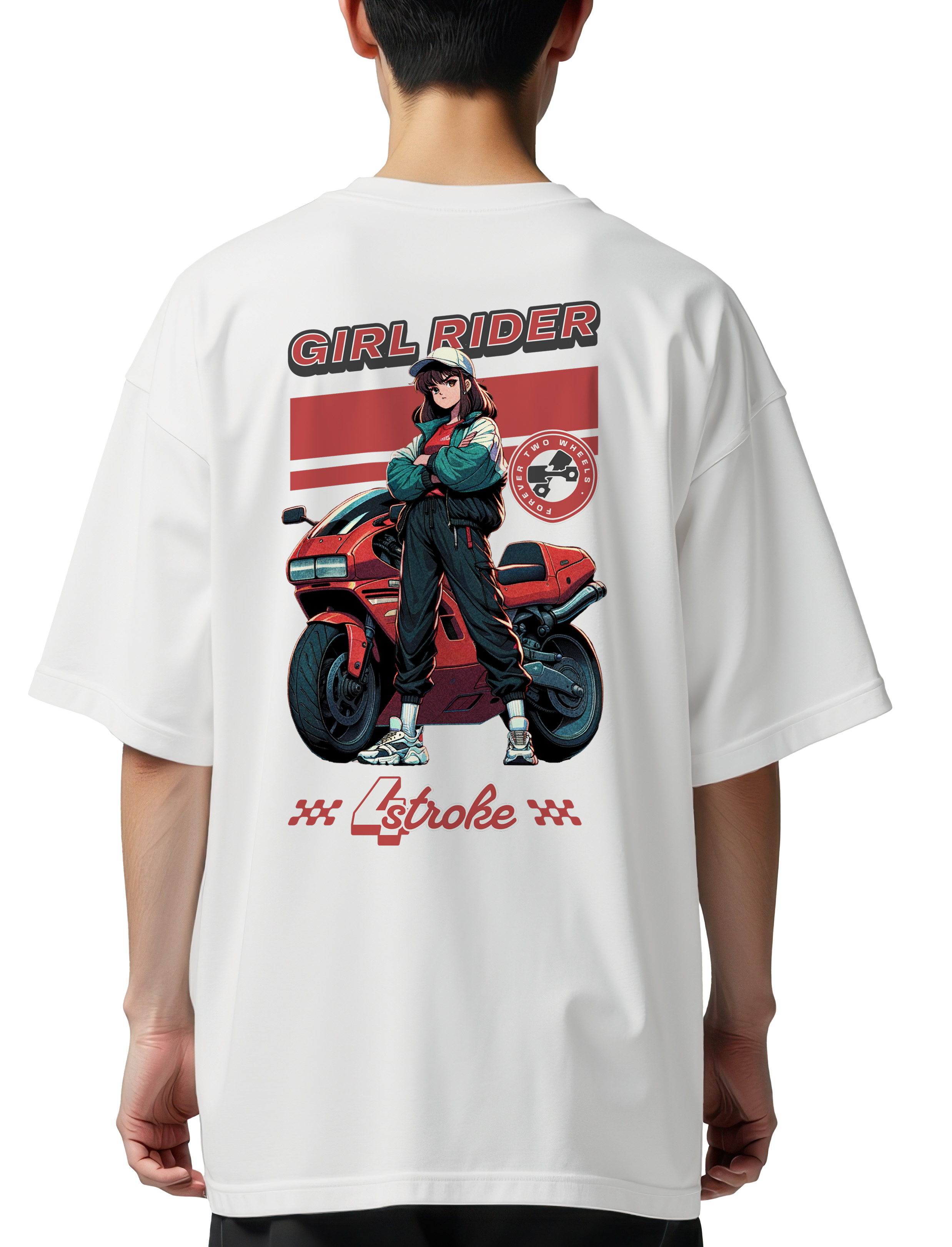 Anime «GIRL RIDER» μπροστά σε κόκκινη μηχανή· έμβλημα «ΓΙΑ ΠΑΝΤΑ ΔΥΟ ΤΡΟΧΕΣ».