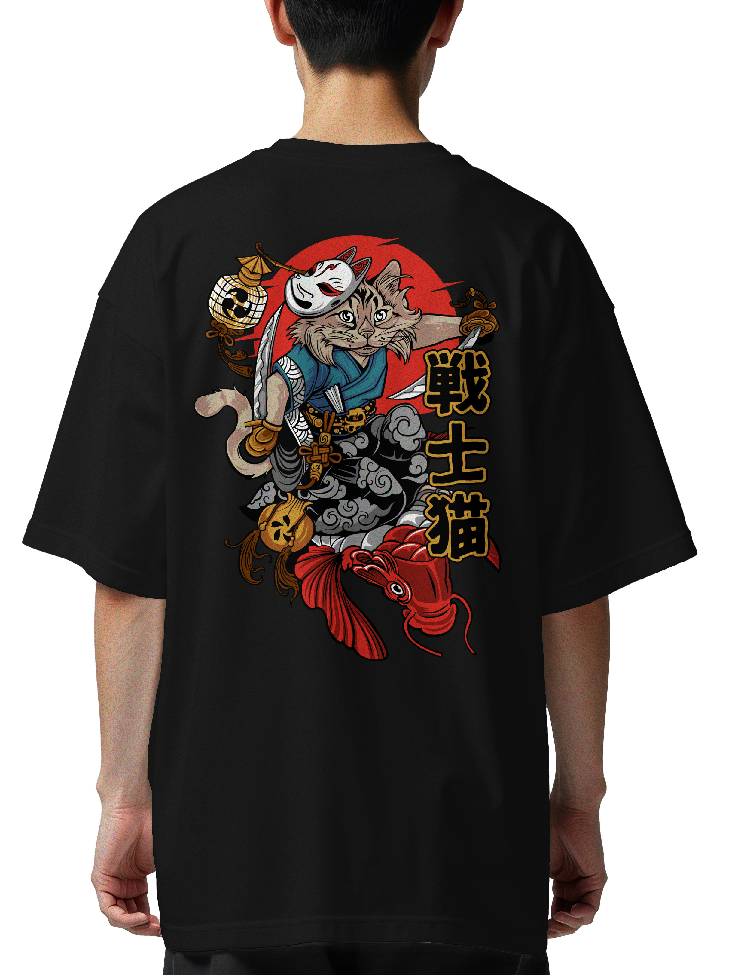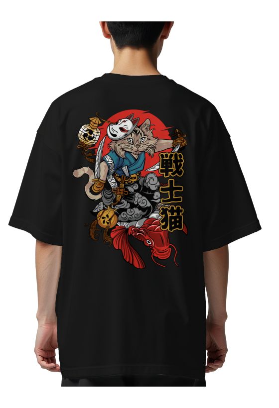 Oversized T-Shirt Cat Samurai Pop Culture Black