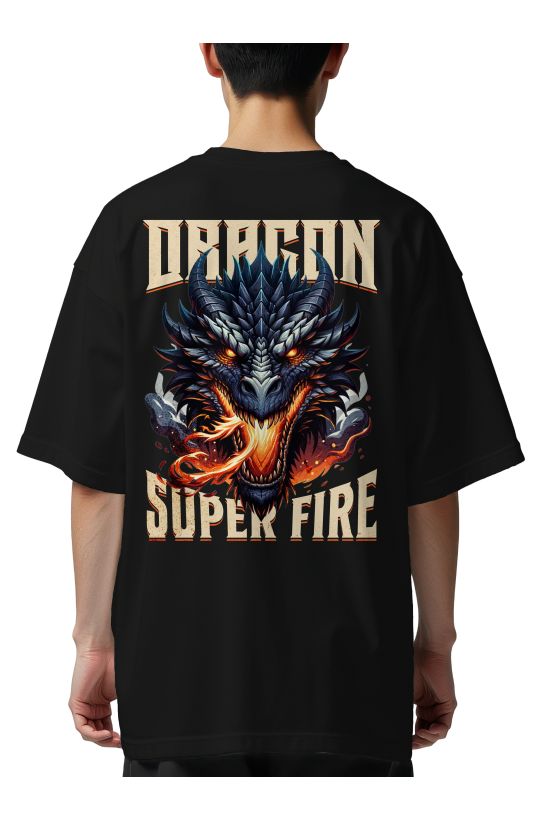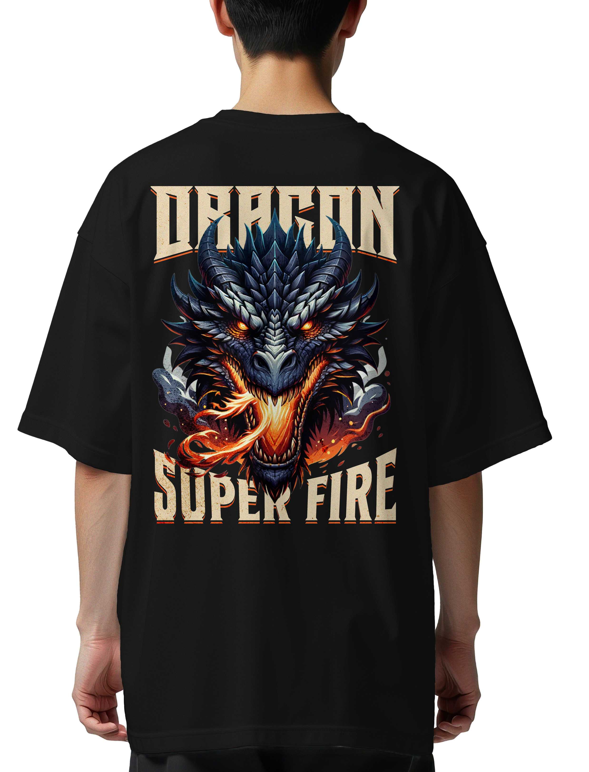 Δράκος με πορτοκαλί μάτια που εκπνέει φωτιά. Κείμενα: «DRAGON», «SUPER FIRE». Δύναμη και μύθος.