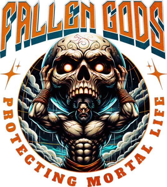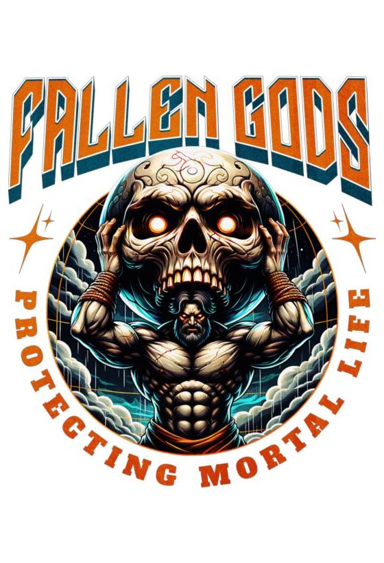 Μυώδης φιγούρα κρατά κολοσσιαίο κρανίο. Κείμενο: «ΠΡΟΣΤΑΣΙΑ ΤΟΥ ΘΝΗΤΟΥ ΖΩΗΣ». Θέμα θυσίας και καθήκοντος.