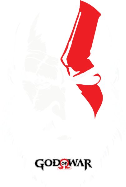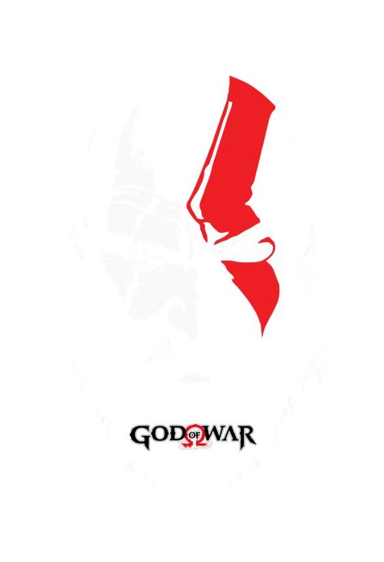 Μινιμαλιστική απεικόνιση Kratos με λευκό δέρμα, κόκκινο τατουάζ και λογότυπο «God of War».