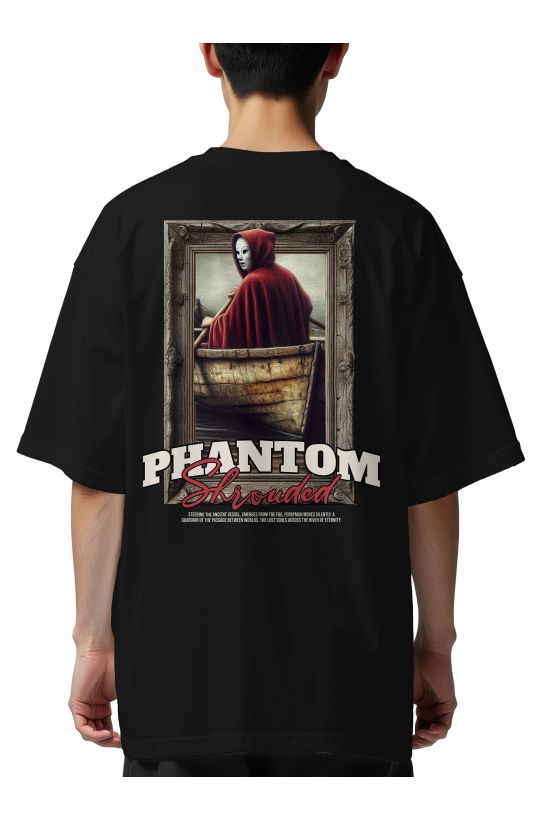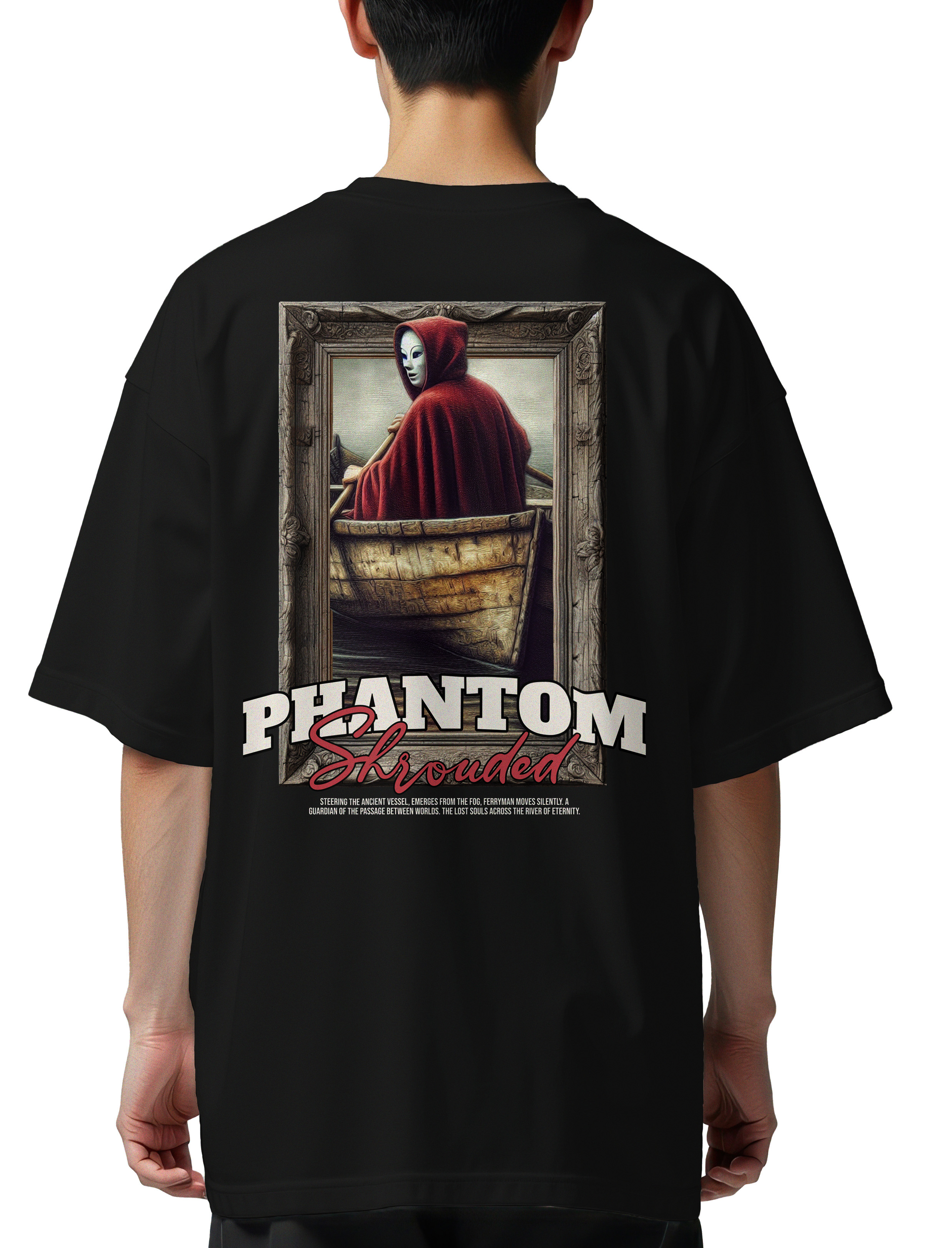 Φιγούρα με κόκκινη κουκούλα και μάσκα οδηγεί βάρκα. Θέμα «Ferryman», πέρασμα ψυχών.