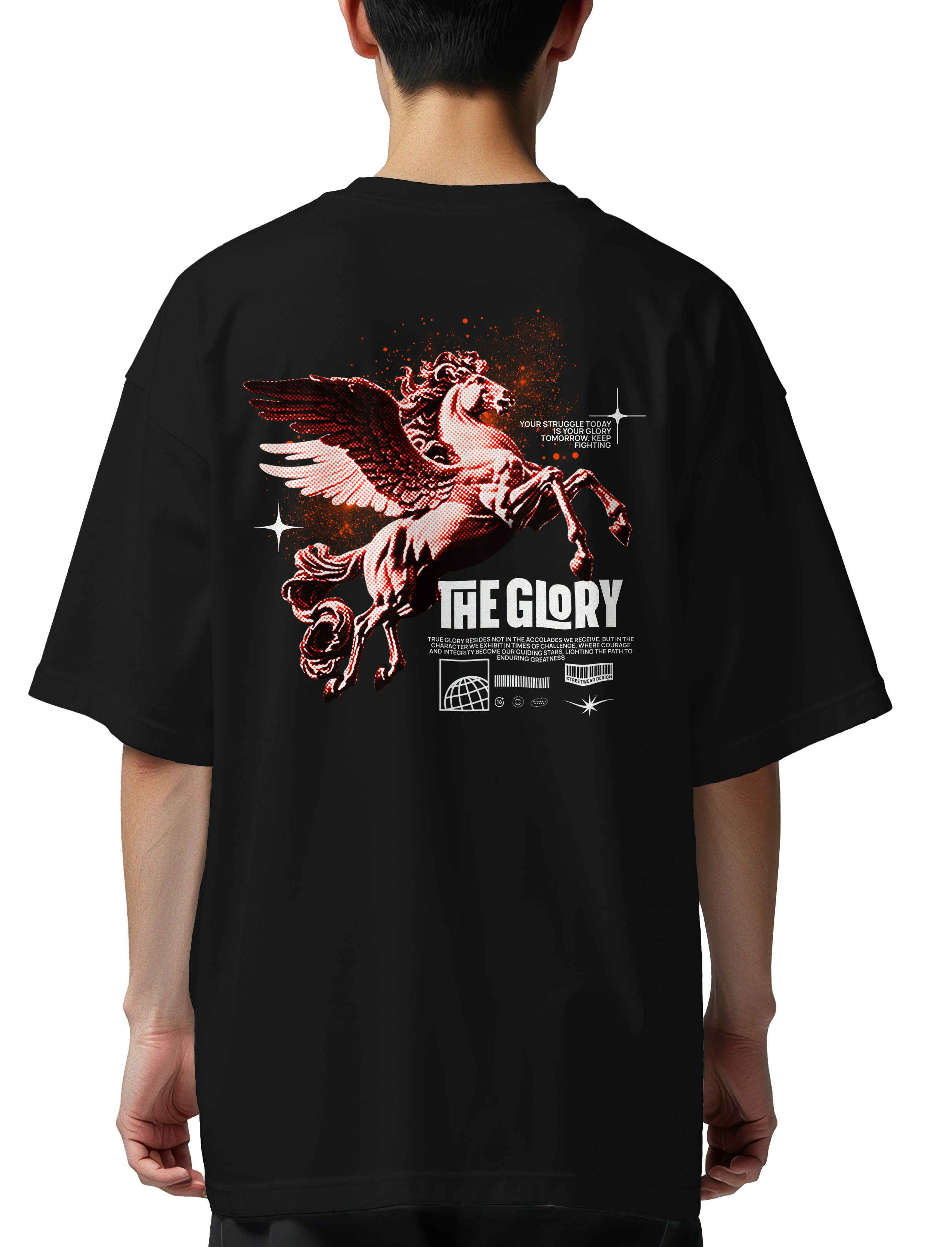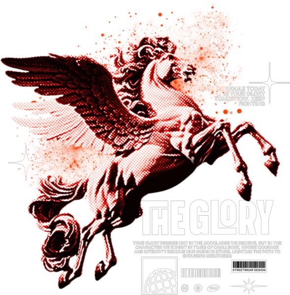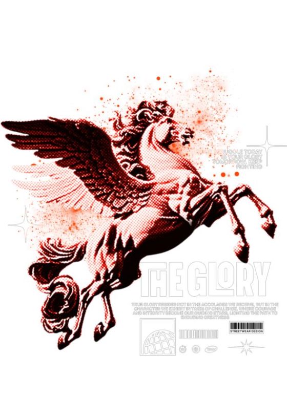 Κόκκινος Pegasus με κείμενα «The GLORY» και μήνυμα επιμονής.