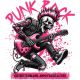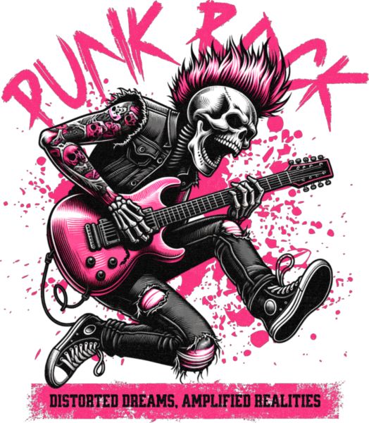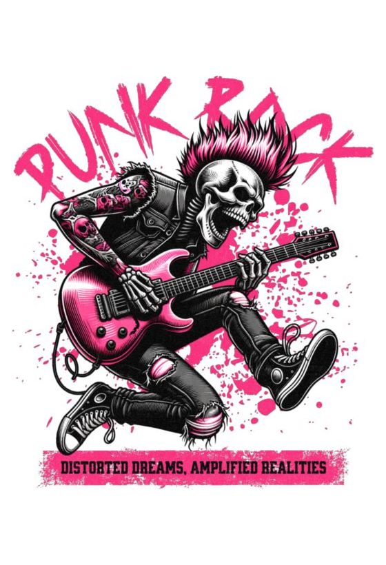 Σκελετός punk με ροζ μοϊκάνα παίζει κιθάρα. Κείμενα «PUNK ROCK» και «DISTORTED DREAMS, AMPLIFIED REALITIES».