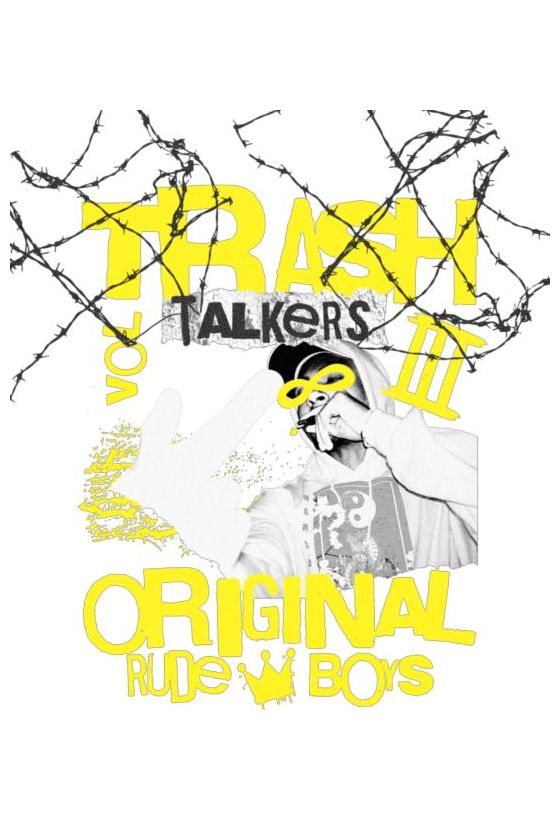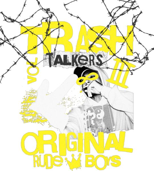 Φιγούρα με κουκούλα και χέρι που δείχνει. Κείμενο «TRASH TALKERS VOL III» και «ORIGINAL RUDE BOYS».