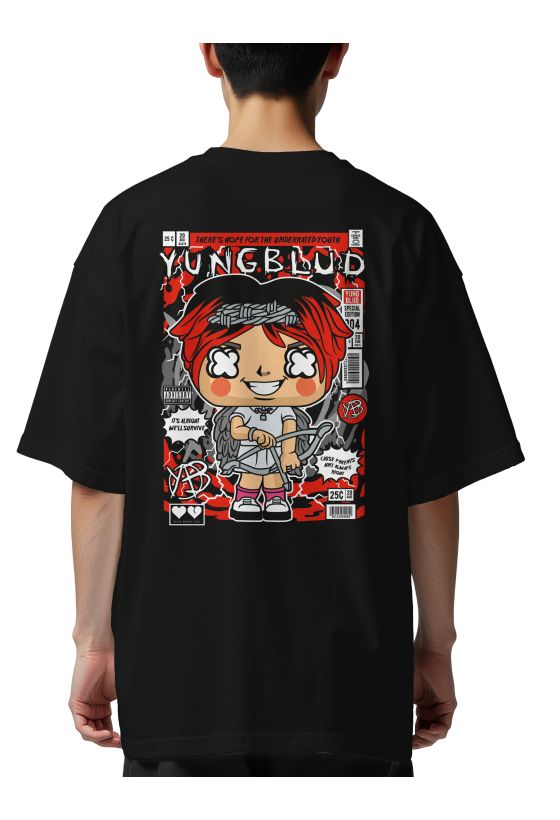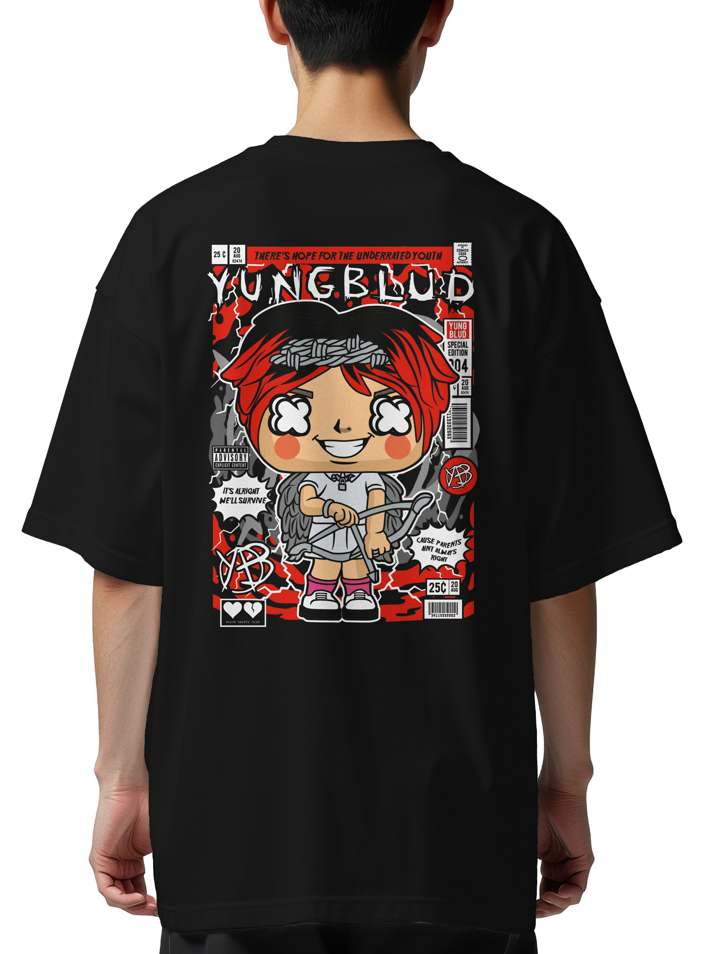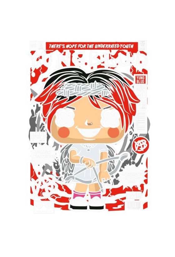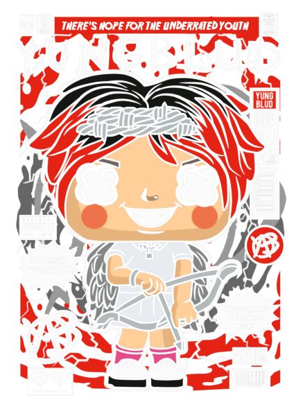 Yungblud σε Funko Pop στυλ κόμικ με φτερά, συρματοπλέγματα και quotes επαναστατικού χαρακτήρα.