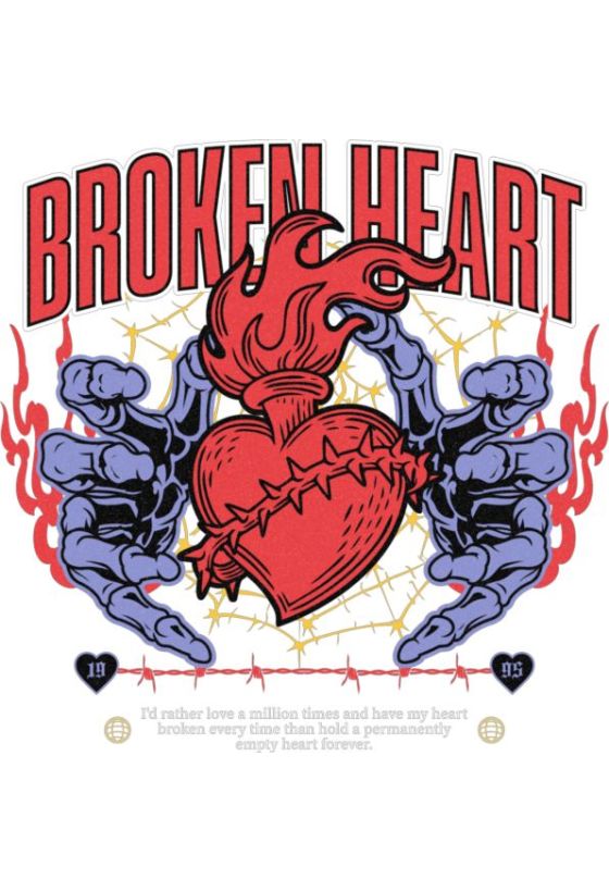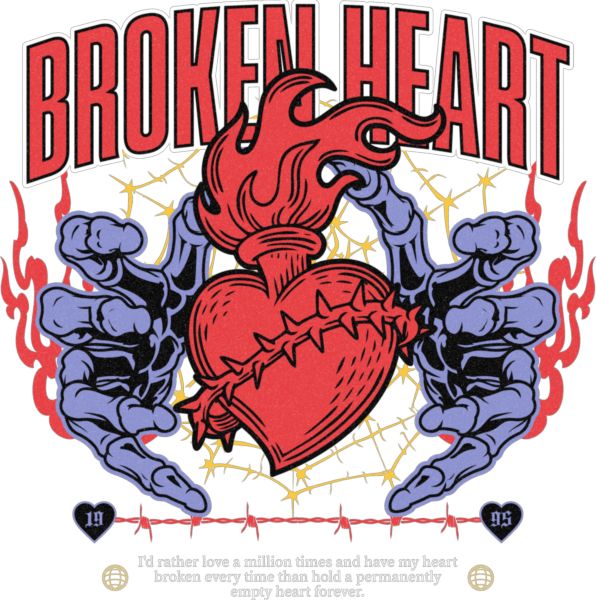 Φλεγόμενη καρδιά με συρματόπλεγμα και σκελετικά χέρια. Κείμενο: «BROKEN HEART». Απόσπασμα για αγάπη και απογοήτευση.