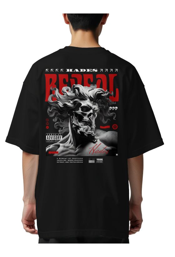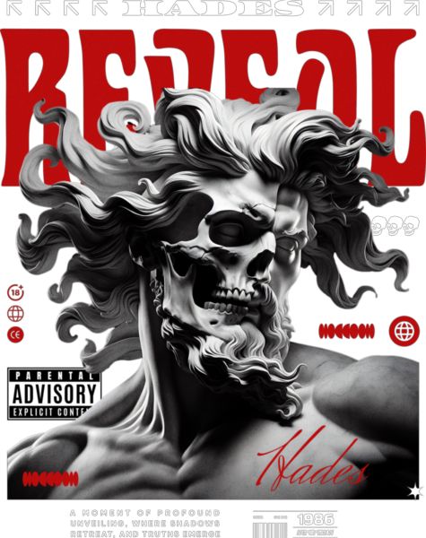 Μαρμάρινο γλυπτό ανδρικής μορφής, μισό πρόσωπο κρανίο. Κείμενο «Reveal» και «Hades», σε μαύρο φόντο με κόκκινα στοιχεία.