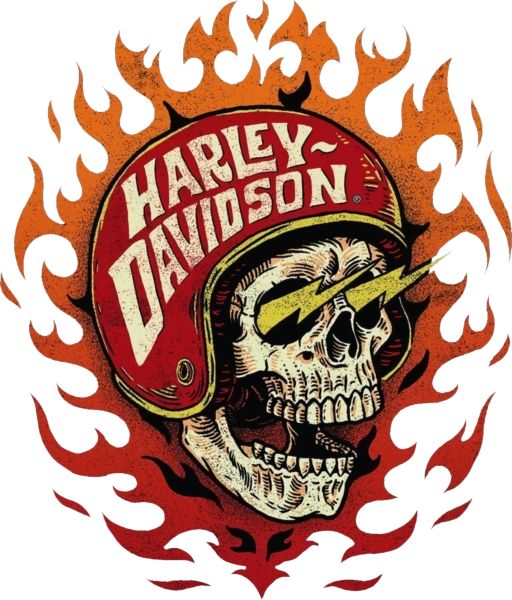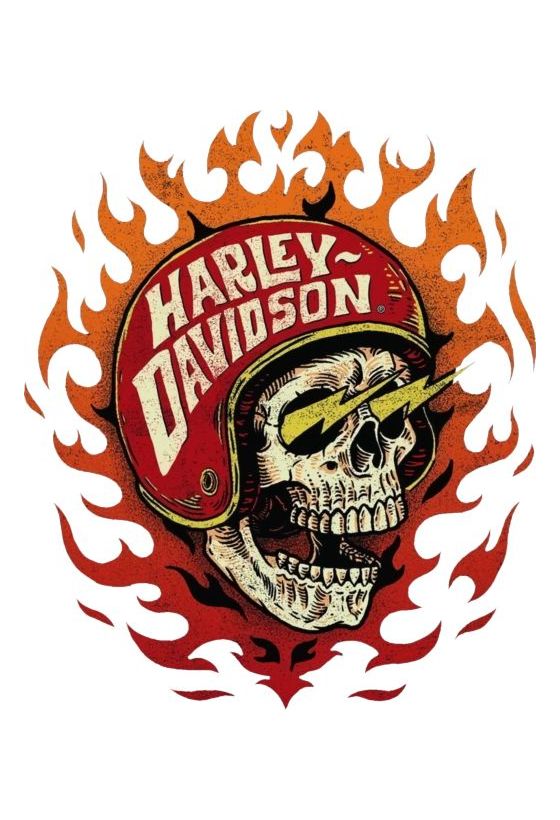 Κρανίο με κόκκινο κράνος Harley-Davidson, κίτρινες αστραπές και φλόγες.