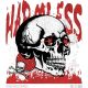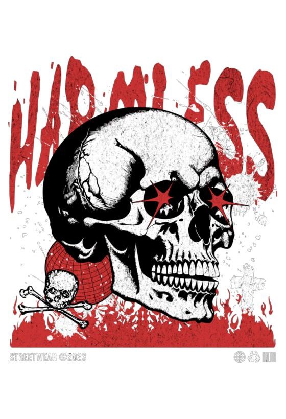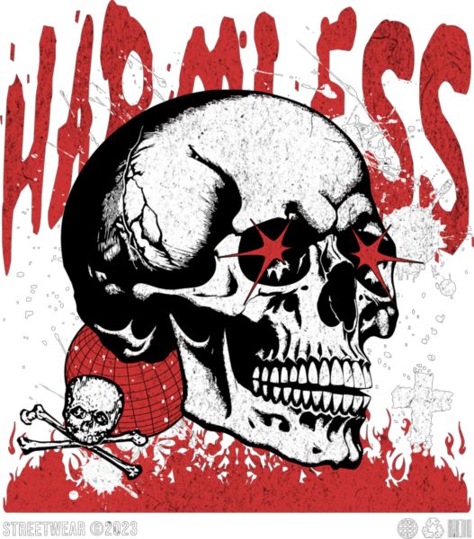 Λευκό κρανίο με κόκκινα μάτια-αστέρια. Κείμενο: «HARMLESS». Σκοτεινό, grunge ύφος.
