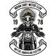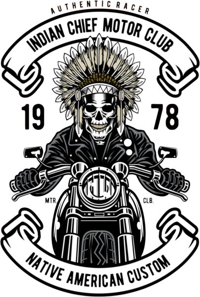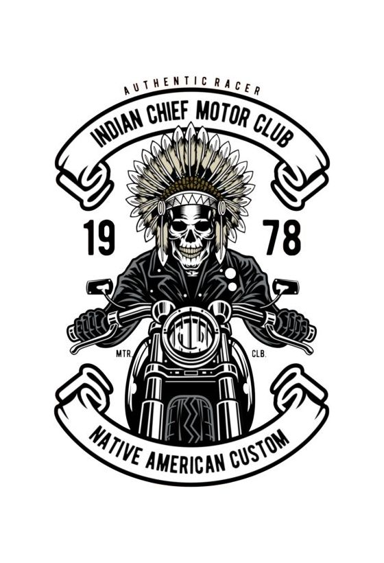 Κρανίο με κόμμωση ινδιάνου σε μοτοσυκλέτα· λογότυπο «INDIAN CHIEF MOTOR CLUB».