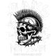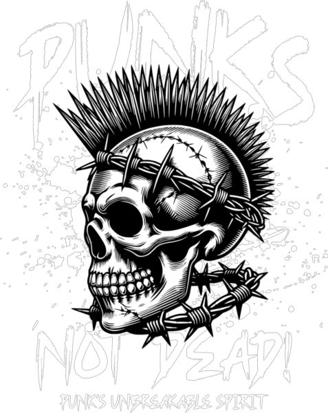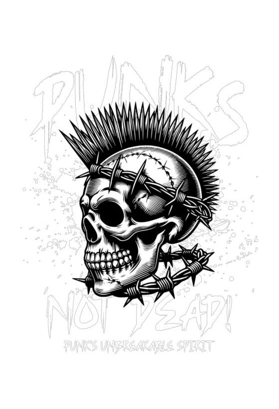 Ασπρόμαυρο σχέδιο με κρανίο, μοχόκ και συρματόπλεγμα. Κείμενο «Punks Not Dead!».