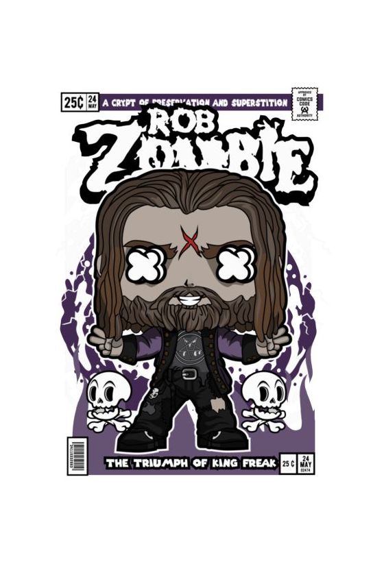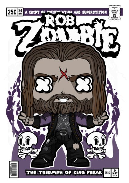 Rob Zombie σε Funko Pop στυλ κόμικ με dreadlocks και κρανία.
