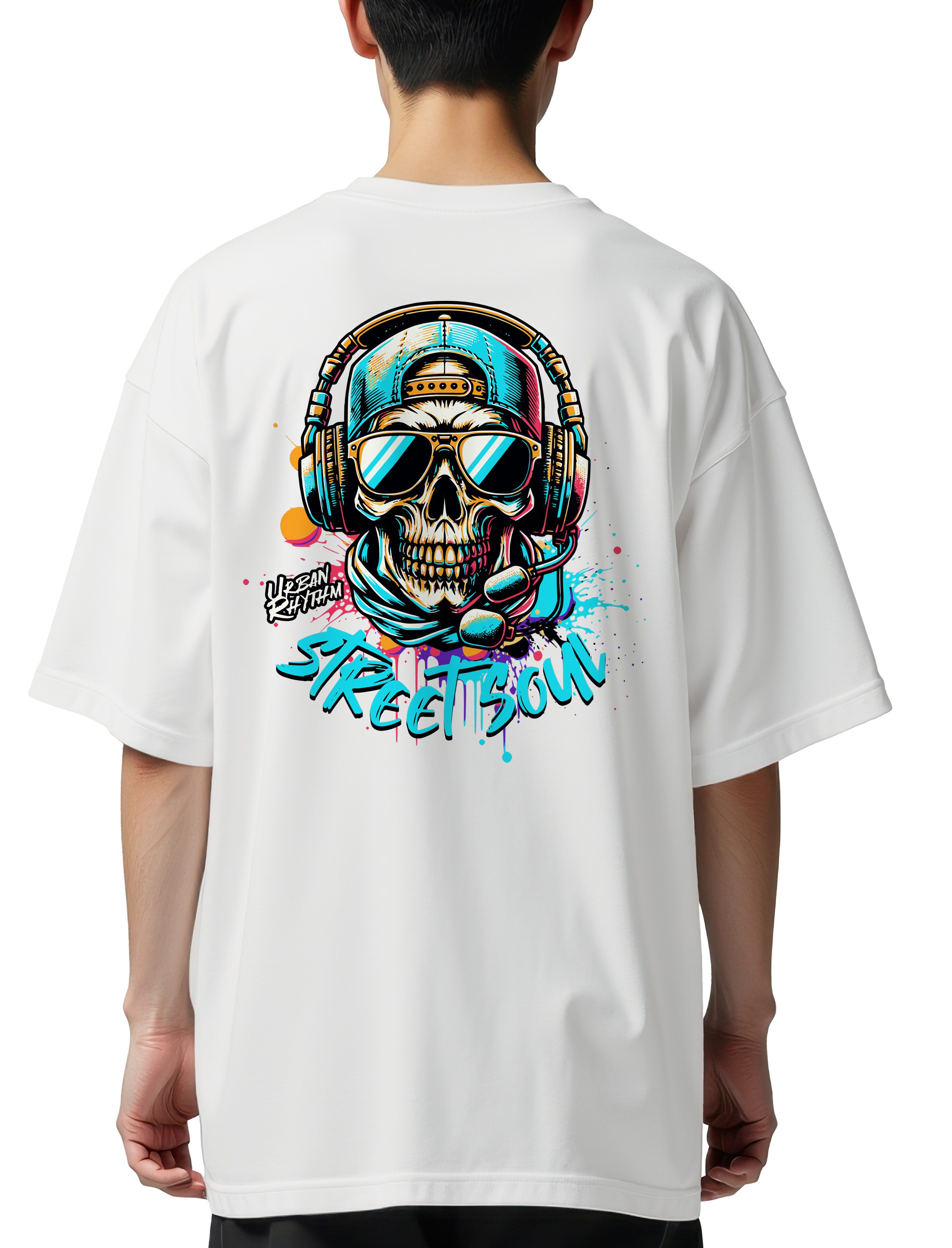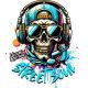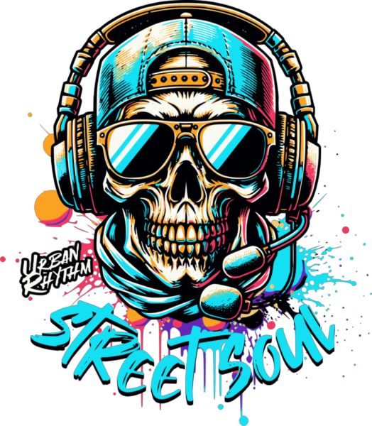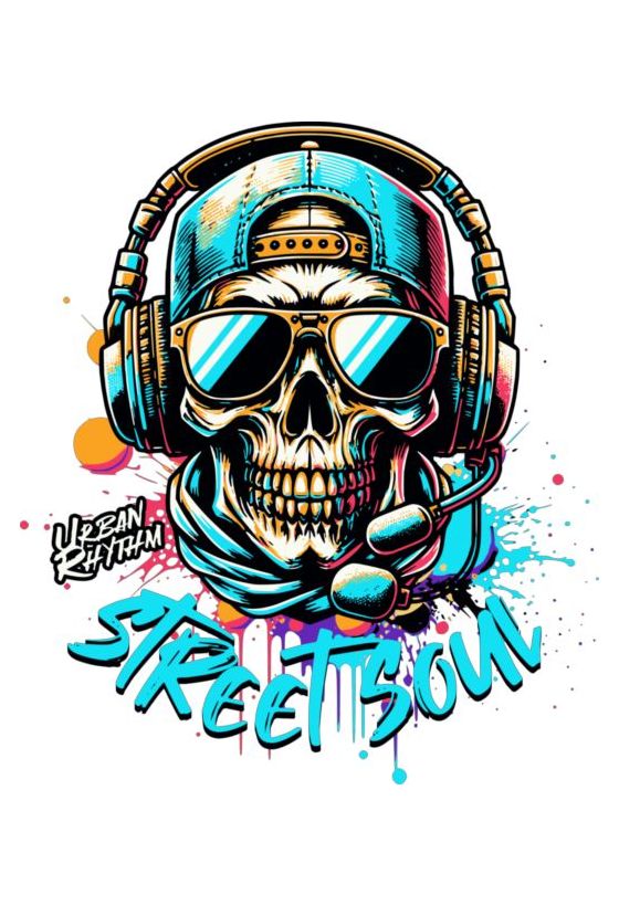 Κρανίο με καπέλο και ακουστικά σε νέον χρώματα. Κείμενα «URBAN RHYTHM», «STREET SOUL». Μουσικό street ύφος.