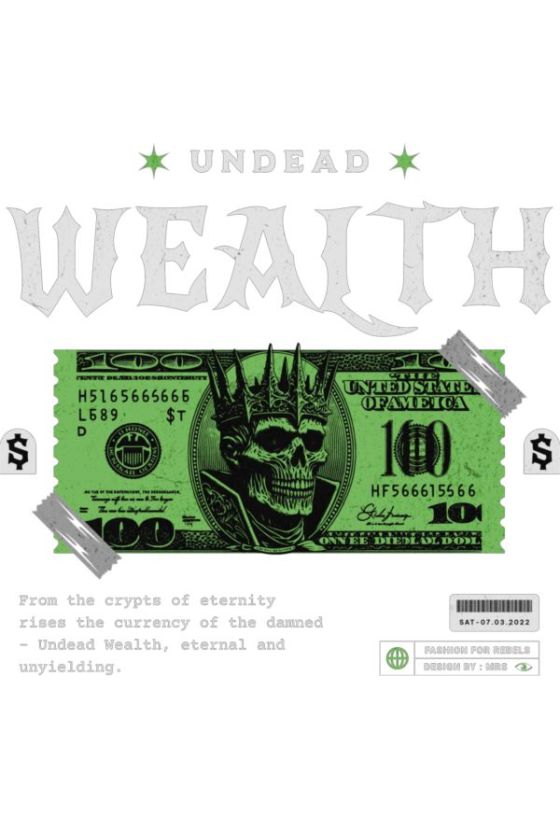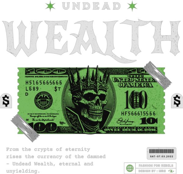 Πράσινο χαρτονόμισμα με κρανίο στο κέντρο, κείμενο «Undead Wealth». Μαύρο φόντο, με επιπλέον φράση για «νόμισμα των καταραμένων».