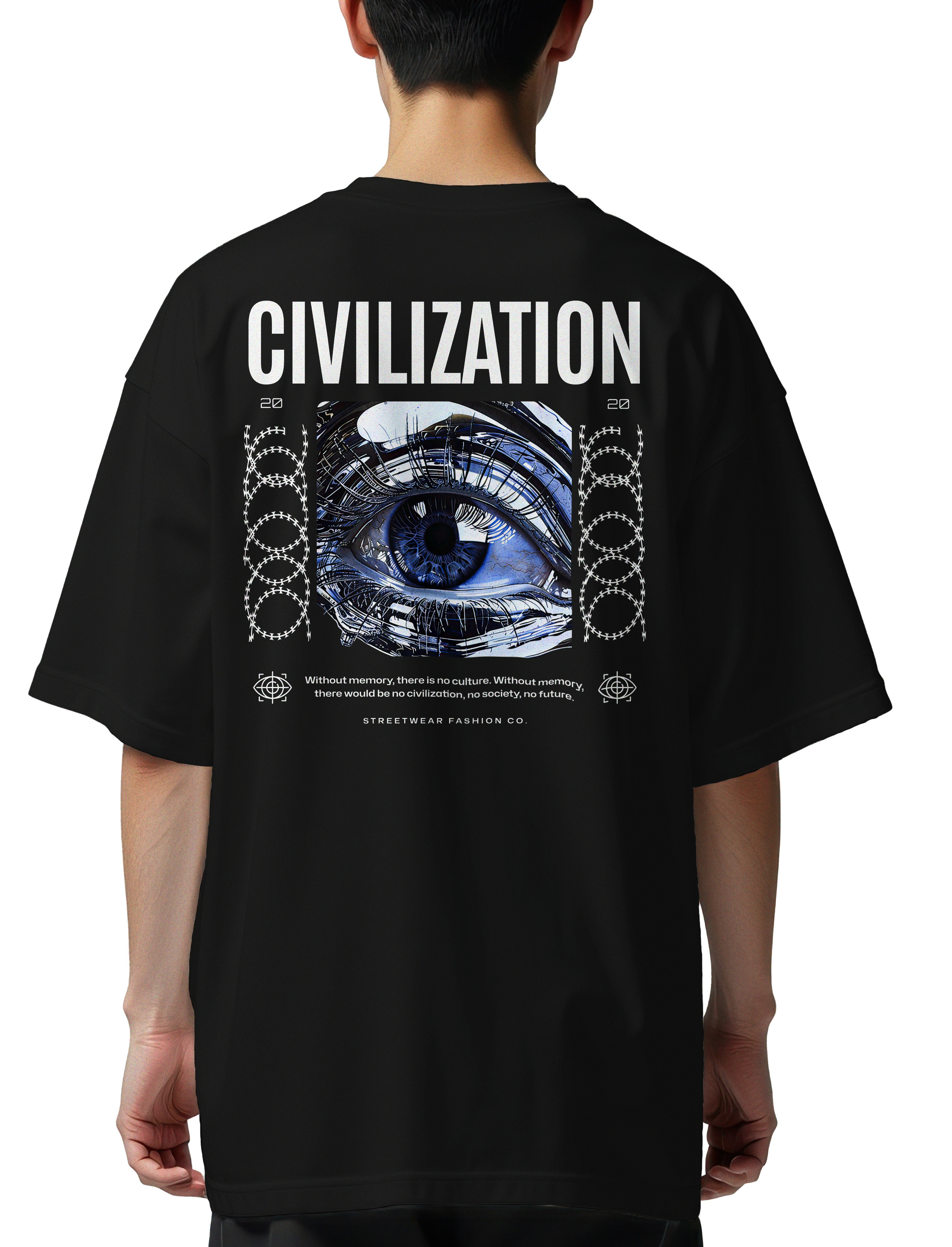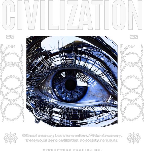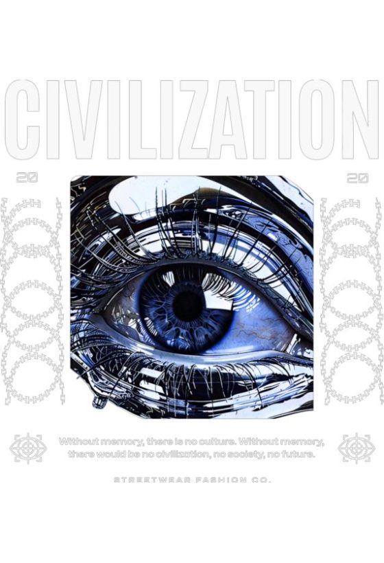 Μπλε μάτι σε στυλ wireframe, φόντο μαύρο, τίτλος «CIVILIZATION», συνοδευτικό απόσπασμα για μνήμη και πολιτισμό.