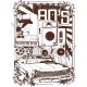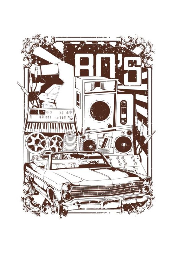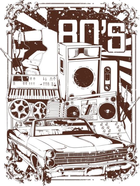 Grunge εικονογράφηση με στοιχεία δεκαετίας ’80 (καμπριολέ, boombox, synth, arcade, μικρόφωνο), σε καφέ-μαύρη παλέτα.