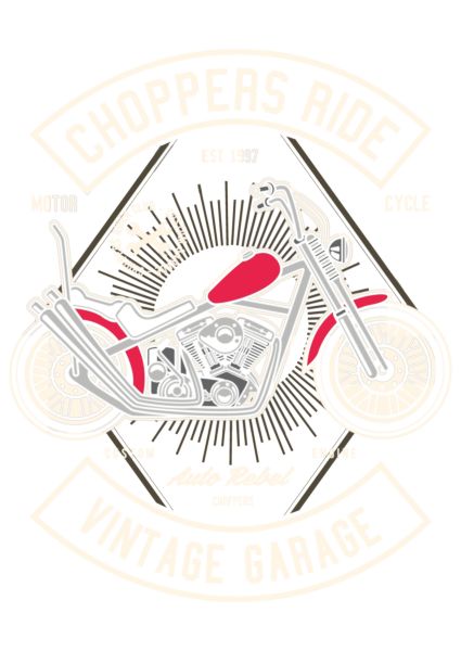 Vintage chopper μοτοσυκλέτα με κόκκινο ρεζερβουάρ, πανό «CHOPPERS RIDE», «VINTAGE GARAGE», «EST 1997».