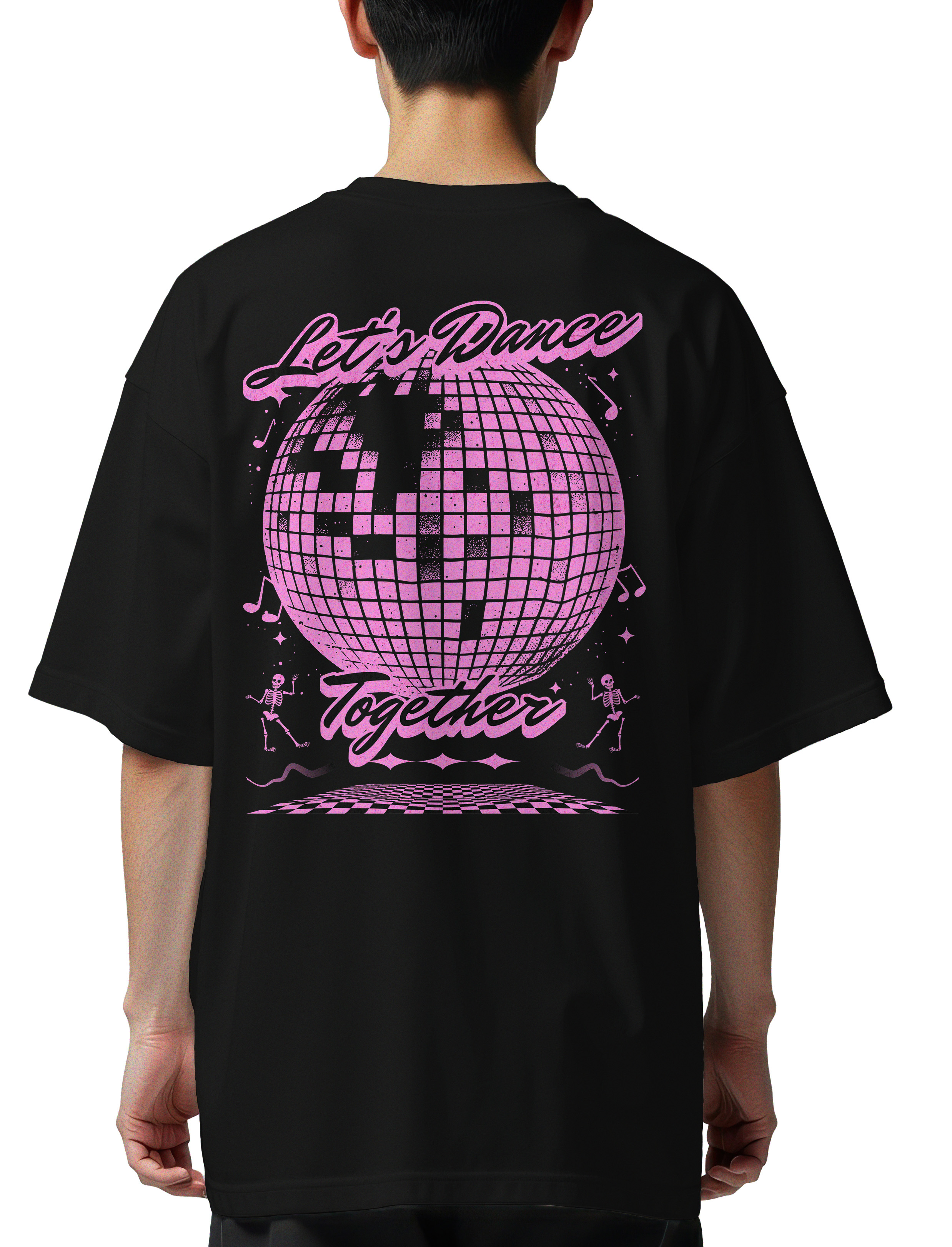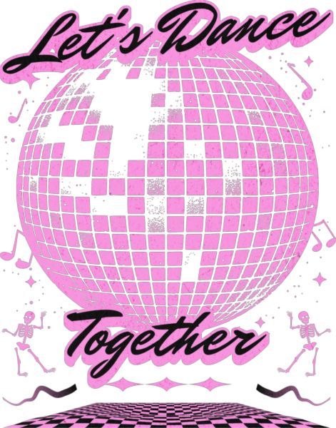 Ροζ μπάλα ντίσκο με αστέρια και μουσικές νότες. Κείμενα «Let’s Dance» και «Together», με δύο σκελετούς που χορεύουν.