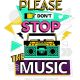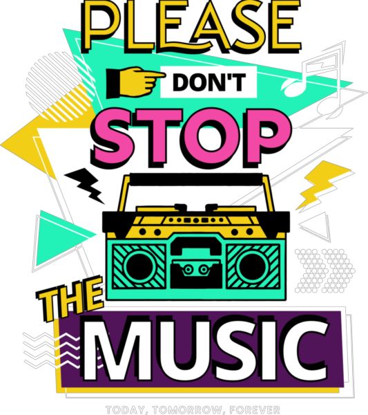 Ρετρό boombox σε μαύρο φόντο με γεωμετρικά σχήματα και κεραυνούς σε κίτρινο, ροζ, γαλαζοπράσινο και μοβ. Κείμενο «Παρακαλώ μη σταματήσετε τη μουσική» και «Σήμερα, Αύριο, Για Πάντα».