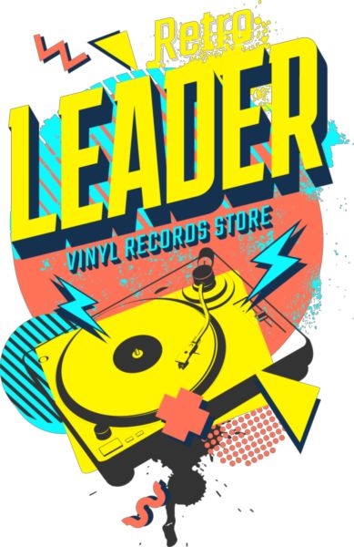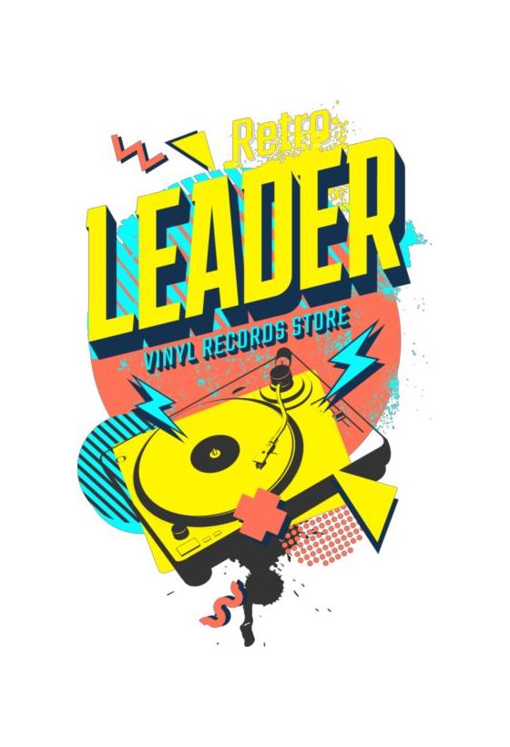 Ρετρό σχέδιο για «Retro Leader Vinyl Records Store». Κίτρινη τυπογραφία με μπλε σκιά, πικάπ και γεωμετρικά μοτίβα.