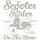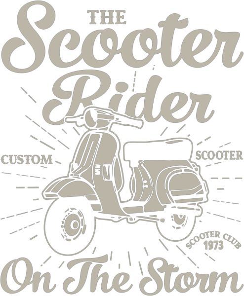 Ανοιχτόχρωμο σκούτερ σε μαύρο φόντο, φράσεις "The Scooter Rider", "Scooter Club 1973".