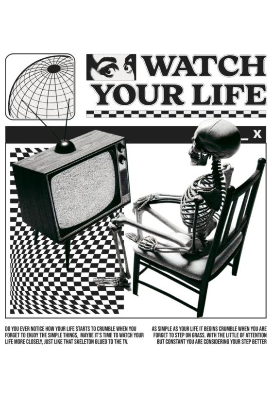 Σκελετός μπροστά σε TV στατικό· «ΠΡΟΣΕΧΕΤΕ τη ΖΩΗ ΣΑΣ», μοτίβο σκακιέρας.